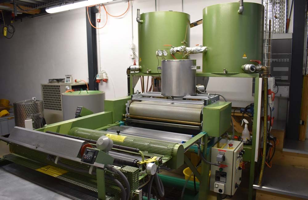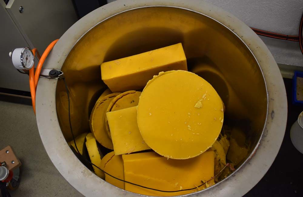 Nous fondons vos blocs de cire dans une cuve puis elle sera stérilisée selon les prescriptions. Après cette première phase, elle sera en décantation (purifiée) pendant de nombreuses heures. Enfin elle sera gaufrée au format désiré.